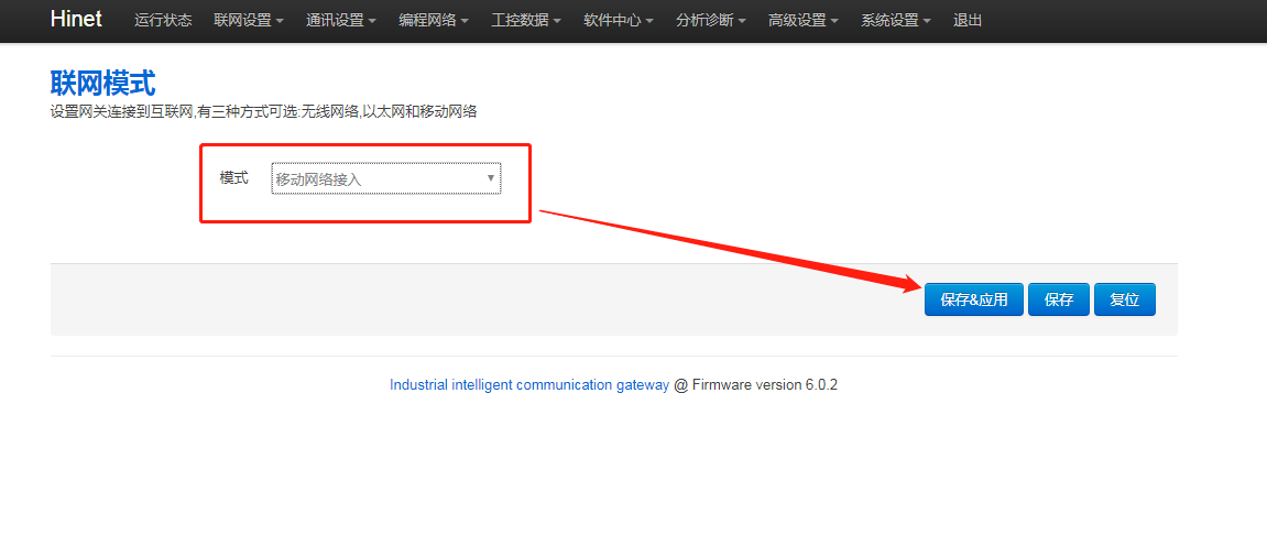 1. 网关后台联网模式是否正确,进网关后台,点击“联网设置 - 联网模式”,修改模式为“移动网络接入”,再点击【保存应用】,重启网关生效。