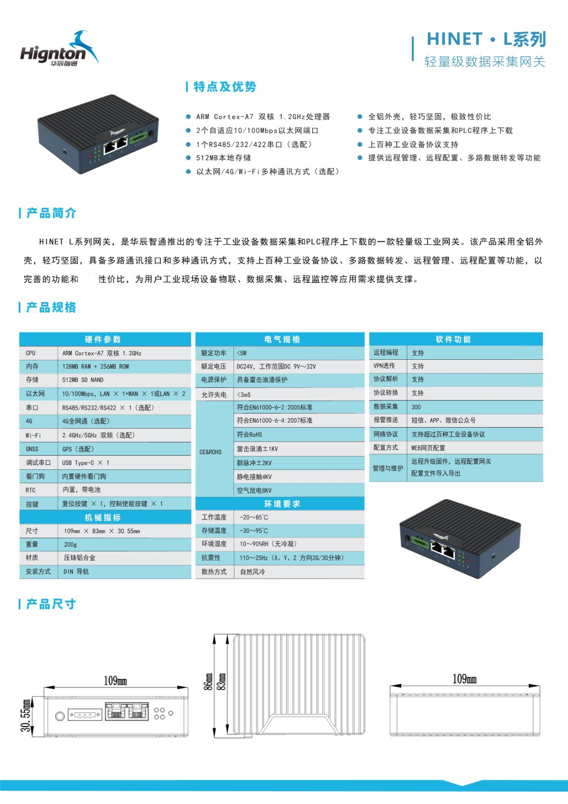 HINET L系列网关,是dcbox小金库(中国)智通推出的专注于工业设备数据采集和PLC程序上下载的一款轻量级工业网关。该产品采用全铝外 壳,轻巧坚固,具备多路通讯接口和多种通讯方式,支持上百种工业设备协议、多路数据转发、远程管理、远程配置等功能,以 完善的功能和性价比,为用户工业现场设备物联、数据采集、远程监控等应用需求给予支撑。